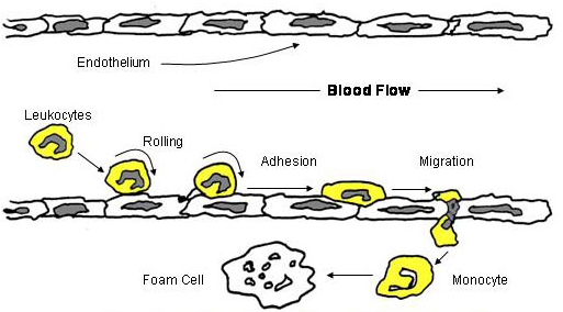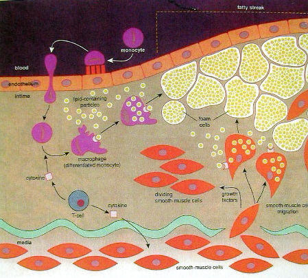Complex pathogenesis of atherosclerosis is involved in various theories, e.g. fatty infiltration theory, response-to-injury theory. LDL-C passes through injured endothelium to enter internal membrane. Oxidized ox-LDL-C damages endothelial function further. Then, monocytes and lymphocytes are adhered on endothelium and migrate to internal membrane, transformed to macrophages further. Phagocytosis of ox-LDL-C via scavenger receptor forms foam cells and early fatty streak.