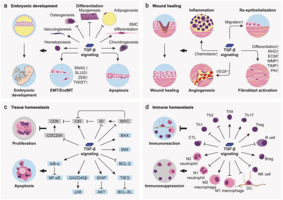 Roles of TGF Beta in biological process are very significant. TGF Beta can inhibit various cells, especially proliferation of epithelial cells and immunocytes. For differentiation, TGF Beta is involved in stem cell differentiation and tissue formation in embryonic development. Besides, TGF Beta can also promote the synthesis of collagen, fibronectin and proteoglycan, thus maintaining the stabilization of tissue structure and extracellular matrix.