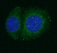 Immunofluorescent analysis of HeLa cells using FNab09798( AMH Antibody) at dilution of 1:50 and Alexa Fluor 488-conjugated Goat Anti-Rabbit IgG(H+L)