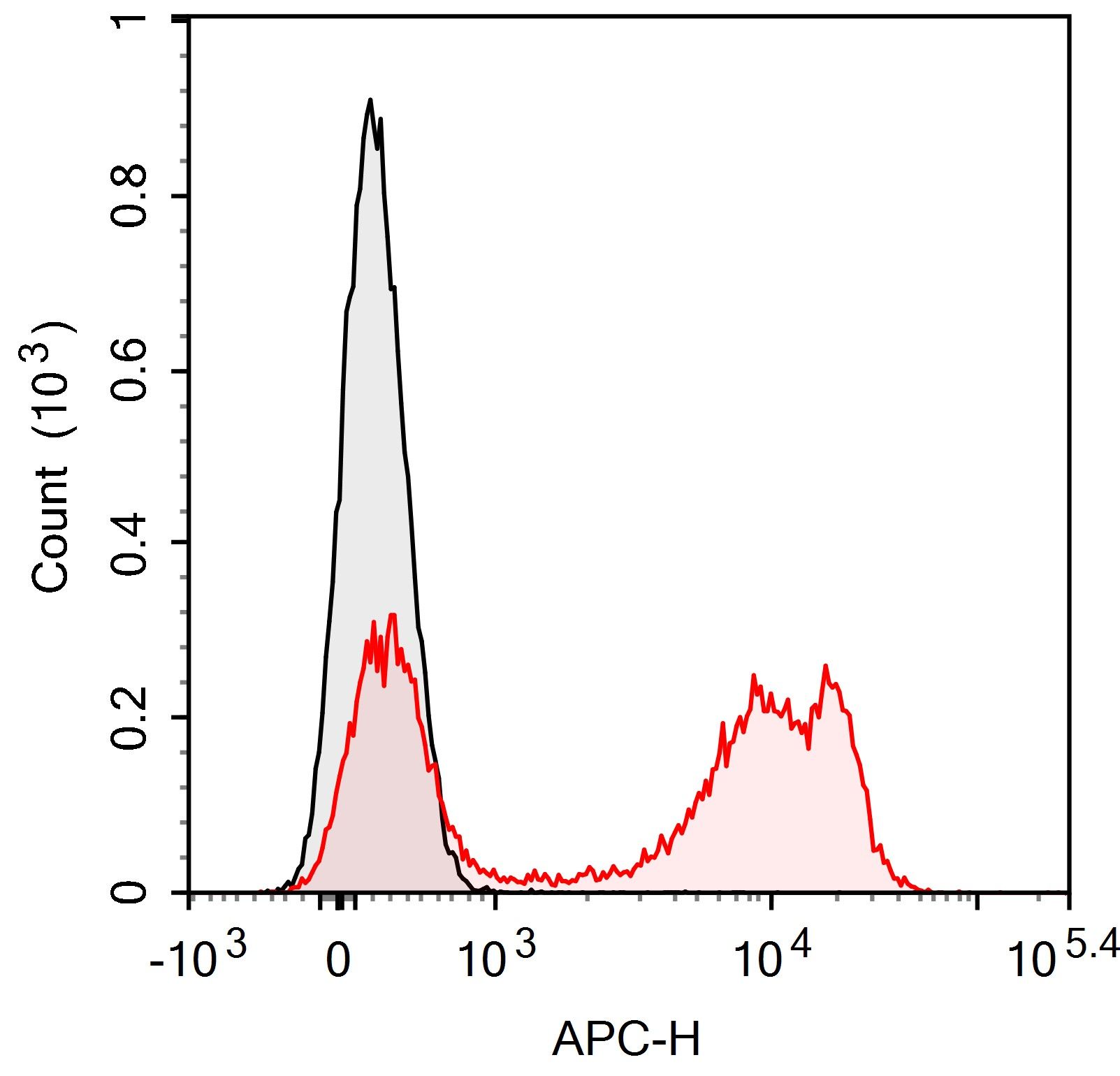 KM mouse splenocytes are stained with APC Anti-Mouse CD22 Antibody (red histogram)or APC Mouse IgG1, κ Isotype Control (black histogram).