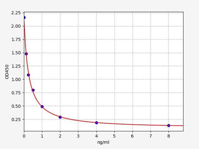 STD.(ng/ml) OD-1 OD-2 Average 0 2.142 2.252 2.186 0.125 1.947 2.047 1.987 0.25 1.804 1.896 1.841 0.5 1.667 1.752 1.701 1 1.368 1.438 1.396 2 1.066 1.121 1.088 4 0.747 0.785 0.762 8 0.462 0.485 0.471