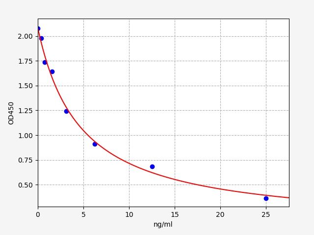 STD.(ng/ml) OD-1 OD-2 Average 0 2.047 2.107 2.077 0.391 1.949 2.005 1.977 0.781 1.714 1.764 1.739 1.562 1.62 1.668 1.644 3.125 1.223 1.259 1.241 6.25 0.9 0.926 0.913 12.5 0.675 0.695 0.685 25 0.358 0.368 0.363