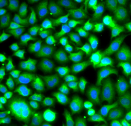 Immunofluorescence analysis of A549 cells using FNab04811(PSMB8 antibody). Blue: DAPI for nuclear staining.