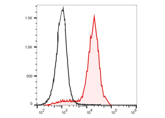 Staining of C57BL/6 murine bone marrow cells with FineTest® Violet 610 Anti-Mouse/Human CD11b Antibody(M1/70) (filled red histogram) or Elab Fluor® Violet 610 Rat IgG2b, κ Isotype Control (empty black histogram). Total viable cells were used for analysis.